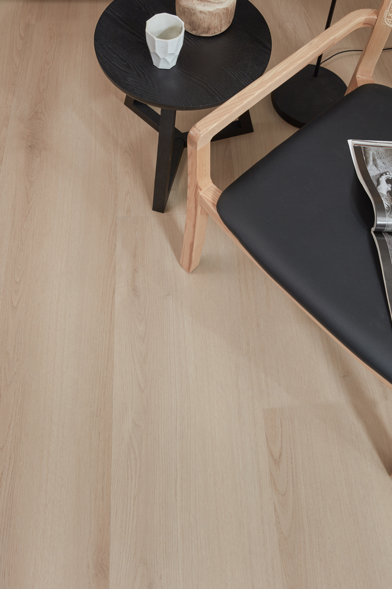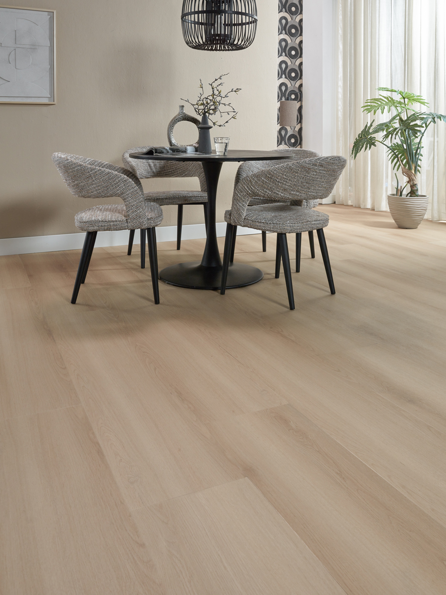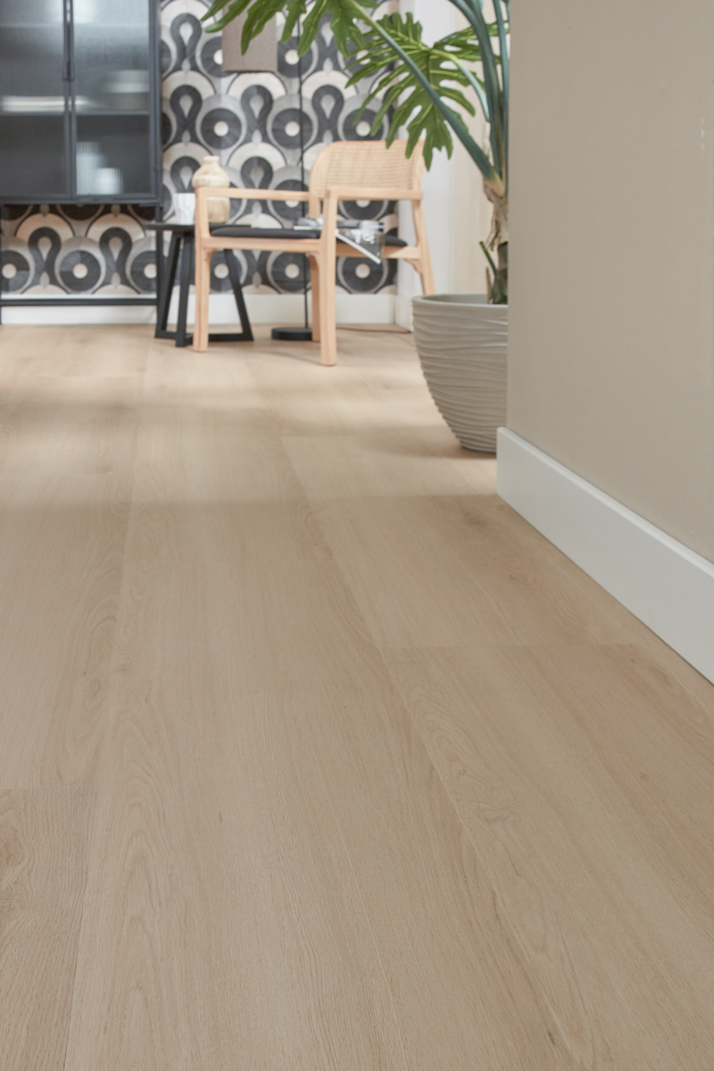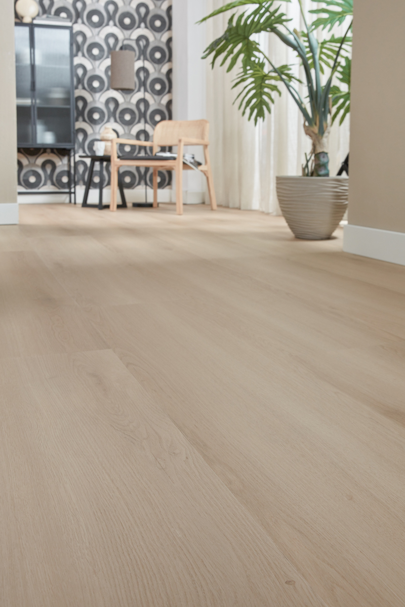 De 0,55 mm slijtlaag beschermt de vloer tegen krassen, slijtage en intensief belopen zones.