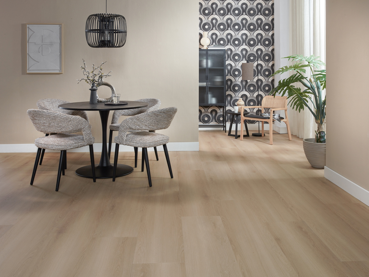Warm, natuurlijk en stijlvol: de Landhuis PVC Lichtbruine Eik is een hoogwaardige vloer met een elegante, lichte eiken uitstraling.