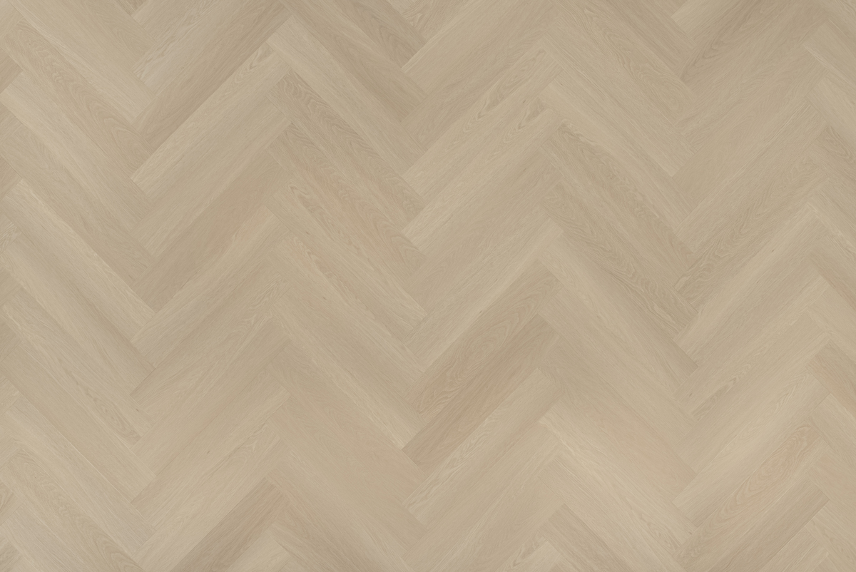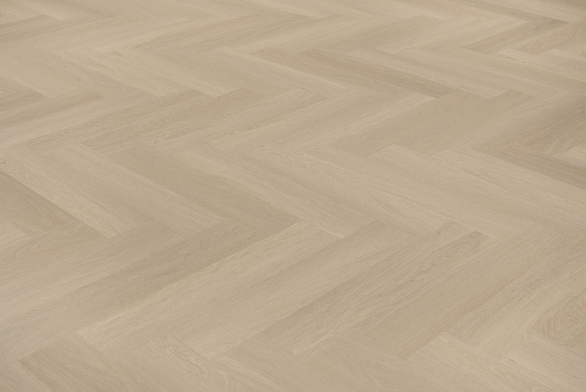 De vierzijdige microvelling accentueert subtiel de randen van de planken, wat de visgraattekening extra tot zijn recht laat komen.